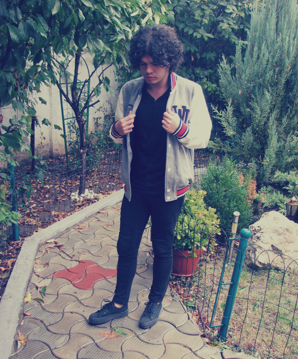 In aceasta zi mohorata pentru unii, eu mi-am gasit inspiratia pentru acest outfit post. Tinuta este foarte simpla, all black, piesa de rezistenta fiind jacheta stil American College Boy. Nu cred a fost vreodata asortata la o jacheta de genul asta, pantaloni skinny, pantofi stil Creepers si o bluza neagra simpla. (Eu cel putin nu am vazut nicaieri. Si recunosc ca arat ca un micut Emo :)) Defapt chiar am fost o perioada adeptul stilului Emo in timpul liceului. Asta este un secret pe care l-am divulgat acum in exclusivitate haha:))